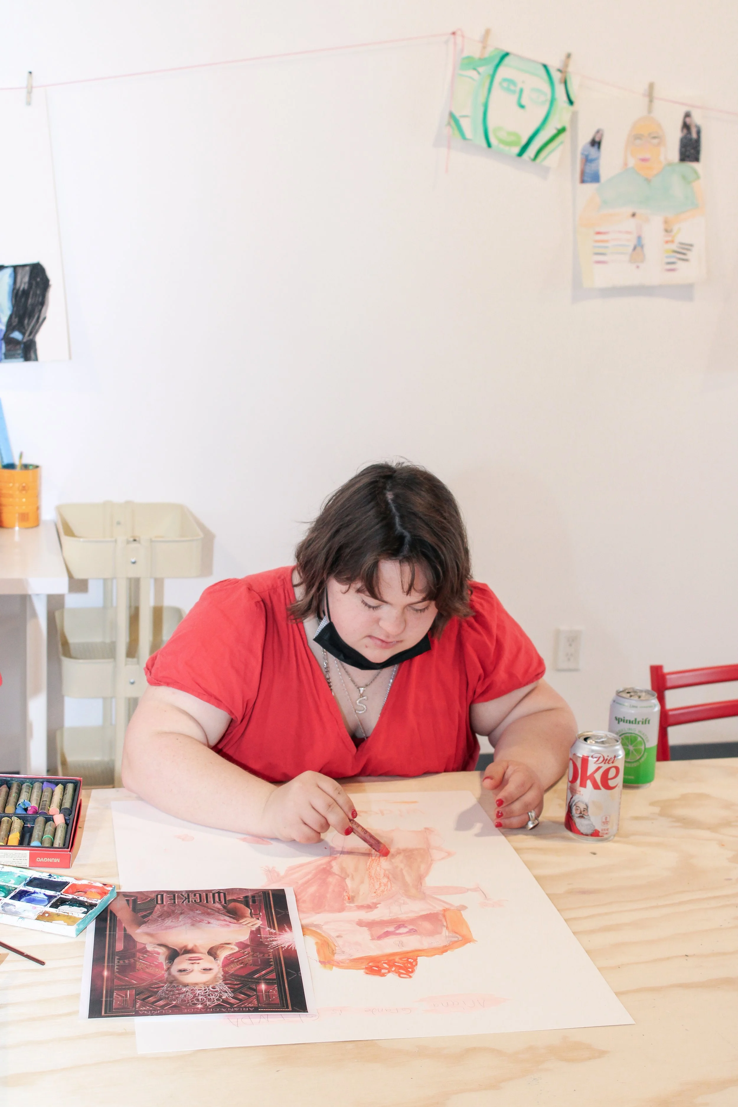 Our team supports each artist in developing their craft, preparing for exhibitions, brainstorming merchandise ideas, and pursuing art-based opportunities both within the community and beyond. The studio offers a mix of individual work tables and a large shared community table, allowing artists to choose the space that best suits their comfort and creative process.